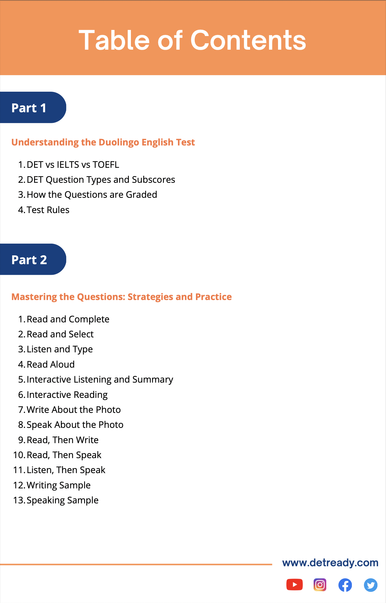 Feeling lost about the Duolingo English Test? I've got you covered. This Ultimate Guide e-book is here to make the test easy to understand. It's packed with effective steps for each question, strategies and tips, plenty of practice questions, and 3x Full Tests for your test preparation. Don't just take the test – MASTER it!